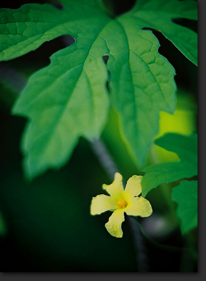 今にも雨が降りそうな朝、ゴーヤの葉と花です。花の直径は2cm程度の小さな花で午後にはすぼみます。ケンコー製アポタイプクローズアップレンズの焦点距離500mmを使用。近接撮影でズームは便利ですね。ホワッとしたボケ方はこのレンズの特徴で単にシャープなだけならキロンで良いし形を残しつつソフトにアウトしてゆくのがイイ。葉っぱのボケ方がそれを語っていると思います。私は周辺光量不足賛成派でして、何ら欠点と感じません。むしろなだらかな周辺光量不足は焼き込み効果を生み画面全体が締まります。
