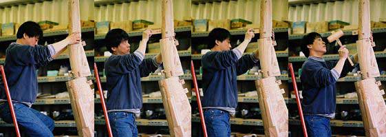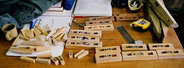 これらは、【空塔】を組み立てるときの留め木。【空塔】は8個のパーツと30数個の留め木から出来ているわけで、それぞれに記号を書いて、どの部分に使う部品なのかを区別できるようにしてあるわけですが、これだけ多くなると間違うこともよくあるそうです。