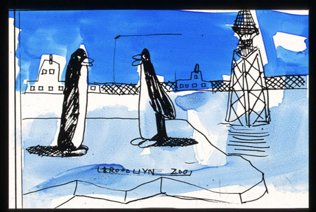 「まず線ありき」これがサイトウさんの流儀です。手の届くところにある紙(画用紙でなくてもいいようです)に適当なペンで思いのままに線書きしていく。人物が描きたいなと思えば描き、横に猫がいれば面白いなぁと思えば猫を描く。形なんかどうでもいいし、色のことは考えない。ただ思いのままにペンを走らす。気が付けば1時間や2時間の間に数枚から十数枚出来上がっていたというのはよくあることのようです。