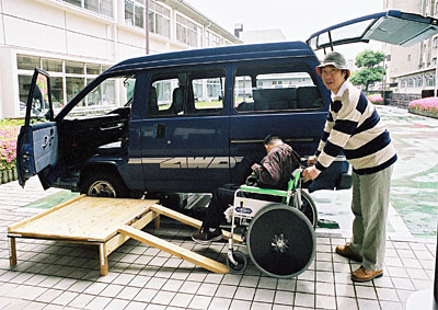 幸田さんが秘密兵器を開発してきてくれました。その名も「乗り降り君」。実に安直な名前の何の変哲もない台ですが、ボクの場合、これがあれば多少座席の高いバンやトラックでも簡単に乗り降りすることが出来ます。元々は幸田さんの撮影用の機材の1つだそうで、それにスロープとなる板を取り付けたもの。「カフェ・グリグリ」のスロープがヒントになったようです。でも、脱輪しそうで少し不安。これからは台を折り畳めるようにして小型軽量化も考えています。