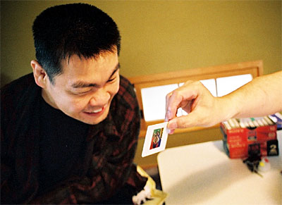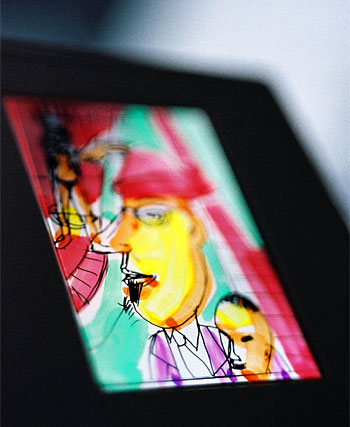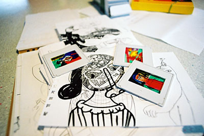 でもそれが完全な完成品かというとそうではないようです。「作品は常に進化する」という表現をしていましたが、これは、線書きの絵に色を塗ることもあるし、写真にとってスライドにしたり、そのスライドにマーカーで色を付けることもあれば、スキャナーで取り込んでデジタル加工を施すこともあり、その課程の一つ一つが一応の完成した作品ではあるものの、今後どのような作品に変化していくのか分らないということだそうで、そんな作品の進化を本人も楽しんでいました。