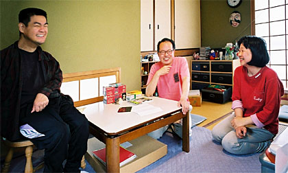 右側の女性は、「ギャラリー拝見」にもご登場いただいた斎藤志津子さん。サイトウシゲジさんとはご夫婦です。お二人は学生時代からの付き合いで、「私は彼の詩のファンで、絵の方はあんまり巧いとは思わなかった」と志津子さん。お互いに作品の批評とかはしあうんですかの質問には、「あまり干渉はしあわないけど、たまに『それいいわー』なんて言われるとやっぱり嬉しい。こいつはどう思てるか知らんけど・・・」「私だっていいって言われたら嬉しいわよ」「ほんまか」とても仲の良さそうな夫婦の会話が聞かれました。