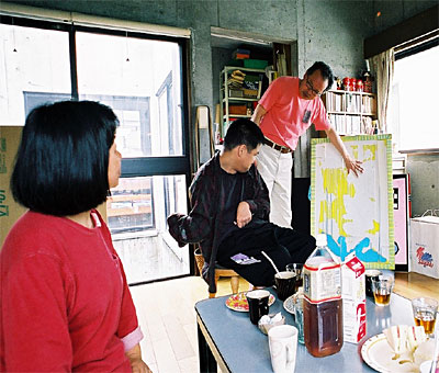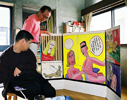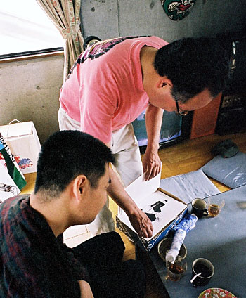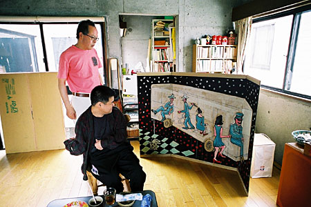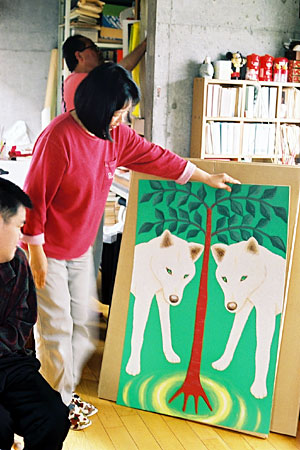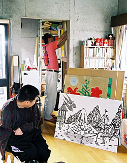 食事が終わると奥の部屋から次々と大きな作品を運び出してきてくれました。サイトウさんの作品は画用紙に描かれているとは限りません。左の写真で彼が持っているのはアルミ板が入っていた箱。働いている印刷会社でこういういらなくなった段ボールを貰ってくるのだそうです。上の絵も下の絵もこの箱を開いて描いたもの。「凄く丈夫だし、こうして畳めばスペースもとらない。屏風のように見せられるのも面白いし、それに、なにしろタダだからね」他にも、拾ってきた石に描いたり板に描いたり・・・。サイトウさんはこういう廃品の再利用がとても上手です。