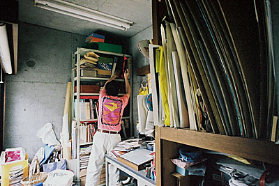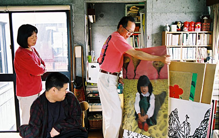 奥の倉庫からは次から次へといろんな作品が出てきました。中には「あっ、こんなのもあった」とサイトウさん自身も忘れていた作品もあったようです。でも、それぞれに思い入れのある作品ばかりみたいで、奥から引きずり出してくるたびにその作品を描いたときの状況や今あらためて見た感想などを話してくれました。