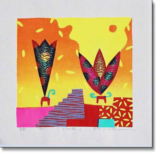 平木さんの制作分野は木版画。絵も描いていますが、それは二紀展への出品を誘われてからだそうです。上の作品は【二つの花】。「画面にエネルギーを入れてくれる活力のある色だから好き」というオレンジと黄色をベースに画面構成された典型的な平木さんの作品です。