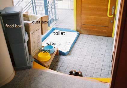 トイレの都合で玄関をクッキーが占領中