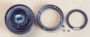 まあめんどい仕組みを頭だけで考えず右側の画像のようにビスを3本を外します。画像は105mmのレンズですが75mmも同じです。105mmの場合後ろ玉を外さないとマウント部分が外れませんが75mmはもっと簡単です。 |