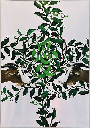 この絵は、ニューヨークのテロ事件のあと「自分にも何か出来ることはないだろうか」と思って描いたモノだそうです。2匹の子羊と絡まる葉、そして、だまし絵的な中央の「愛」の文字。「愛とは」「世界平和とは」と問いかけているかのような画面の背景に、一瞬、世界貿易センターにハイジャック機が突っ込んでいく映像がフラッシュバックされたような気がしました。