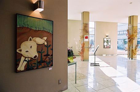 平日の誰もいない会場の南向きの窓からは、まだまだ浅く柔らかい春の光がここぞとばかりに流れ込み、ほのぼのとした心地よい眠気を誘います。左の作品は、斎藤さんのここ数年来のスタイル。今回も彼女の大好きな犬がたくさん登場し、車の展示場というエコノミックな雰囲気を春の日とともに和らげてくれていました。