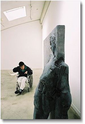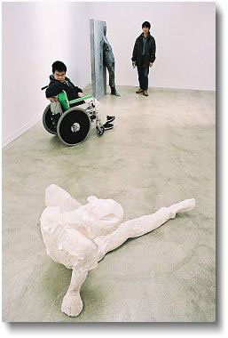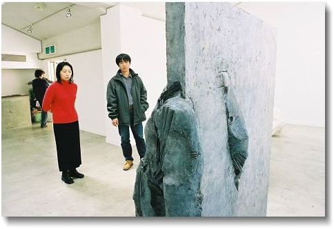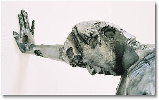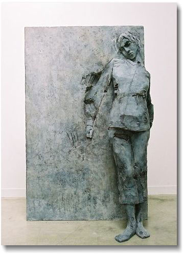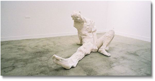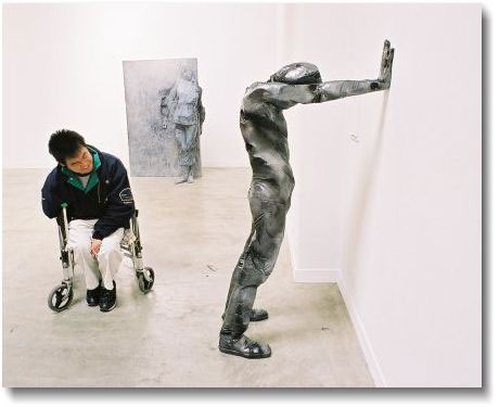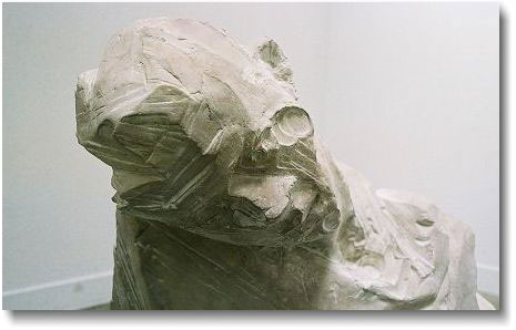 12 ギャラリーの一番奥に足を投げ出して座っているこの作品のタイトルは「グレーなとき」。肉体的にも精神的にも疲れきってどうしようもないという感じでしょうか。やはり全身に殴られた痕。シャープな線は角材で殴りつけた痕、円い凹みは金槌の痕だそうです。ボクも陶器の壺を殴って凹ませていますが、ここまで思い切った殴り方は出来ません。凄
