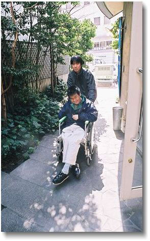 まず、近くにいた男の人に助けを求めます。そして四人で作戦会議。車椅子の前に二人と後ろに一人で何とかなるのではということになりました。このとき車椅子は前輪を上に上げ思いっきりウイリーさせた状態のまま後輪は宙に浮かさず階段に接触させたままひこずるようにして登っていきます。この方法をとると比較的楽に登ることができ、しかも途中で休むことだって可能なわけです。ただ、この方法はすべての車椅子利用者に有効なわけではありません。極端なウイリーを怖がる人も多いし、首か座っていない者や体が安定しない者などは逆に危険です。適正な介助の方法は一人一人違うわけですから介助される本人に聞くのが一番ということです。