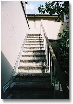 これがその階段です。今回の取材で一番の懸案事項はこの階段でした。幸田さんも井浦さんも車椅子の操作は素人です。しかもこの階段は狭くて非常に担ぎ上げにくい。最悪の場合、今回の取材は中止ということも検討しながらとりあえず階段の下まで行ってみることにしました。