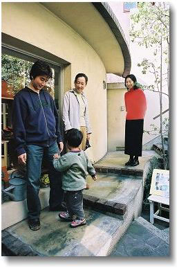 左の写真に写っているご家族は、ギャラリー拝見3回目におじゃました『春夏秋冬の器展』の西昌代さん御一家。会場の中で偶然お会いしました。上月さんが西さんに陶芸を教わっているということで見に来たらしいのですが、実は、ボクらと西さんはこのときが初対面。第3回のギャラリー拝見は電話と手紙でのやりとりだけだったから顔も知りません。そんなボクらに西さんの方から声を掛けてくださいました。世間は狭いものですね。ほんと驚きました。しかも、階段の上り下りを手伝ってくださったのが西さんの旦那さんだったなんて、その時は露ほどにも考えていませんでした。不思議な巡り合わせです。