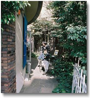 車椅子を押してくれているのは井浦徹二さん。このギャラリー拝見のページを見て共感し、今回からお手伝いしていただけることになりました。もちろんこのときが初対面です。彼は、車椅子を押すのは初めてだと言っていましたが、いろいろと気を使いながら押してくれていたので安心して乗っていられました。それに、彼が同行してくれたおかげで幸田さんが写真に専念でき、左のようなショットが取れるようになったほか、この後おとずれる狭くて急な階段も登ることが出来ました。