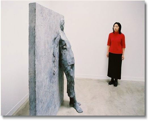 作品は、まずコンクリートの壁があって、そこにもたれかかっているとだんだん壁の中に埋もれていくという非現実的な表現になっていますが、この感覚も何となく分るような気がします。自分は何者なのか、この世に存在していいのだろうか。そう考えるとき物体としての自分がなくなって壁や床の中に溶け込んでいくような感覚になることがあります。それがまさにこの状態ではないでしょうか。_ 作品とは対照的な真っ赤の服を着ているのが上月さん。「作品には表面的な性格とは逆の面が出る」という人がいますが、上月さんと作品を見ているとなるほどなと思います。