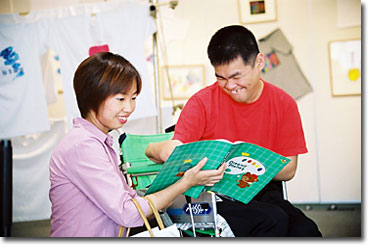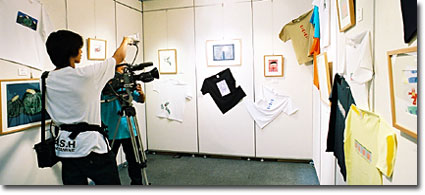 また、ボクらが会場に入ったときには、すでに新聞社やテレビ局などの取材合戦が行われていまた。こういう障害者の作品展にはマスコミはすぐに飛びつきます。あまりいい気はしないけれど、多くの人に見てもらうのには最高の手段。ボクもよく利用させてもらっています。