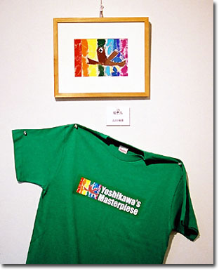 ※バジャー展とは、1994年からハレルヤ・阿波の里の後援で始まった徳島県内のアーティストグループ展でした。会場に入ると、いつものヨンデンギャラリーとはかなり違った雰囲気になっているのに驚きました。Tシャツを洗濯物を干すように物干し竿に掛けて展示してあるのです。室内ですから風はなく、Tシャツがたなびくことはありません。ですが、そよ風が吹いているような爽やかな感じの会場になっていました。とはいうものの、この展示にはかなり苦労されたようで、「昨日夜遅くまでかかって汗びっしょりになりながらしたんじょ」とおっしゃってました。