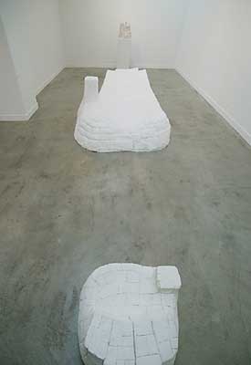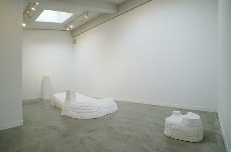 「今まで自分の制作は、粘土を中心にやってきました。粘土で作った作品は、型取りして違う素材に置き換えるか、そのまま焼いてしまうかしないと輸送出来ません。現実的な問題として、ウェイクアップギャラリーに作品を搬入するときに、人力であの階段を持って上がる事を考えると、軽くて強い樹脂が向いていると思いました。しかしその反面、樹脂という素材は、他の彫刻の素材(石、木、金属)などに比べて、素材的な魅力を出すのが難しい。前回の個展では、樹脂に砕いたテラコッタ(素焼き)を混ぜて、樹脂にも焼き物にも見える不思議な素材感を狙いました。しかし、終わってみると、やっぱり本当は土を焼きたかったんだろうなぁと思いました。今回はそんな自分のこだわりを一度すべて捨て去るために、樹脂を樹脂として見せることに、初めて正面切って取り組んでみました。ただ、僕は素材を限定して制作していくつもりはないので、来年は、石や木を彫ってるかも知れません。無意識に自分で自分を縛っていることに気付いたら破りたくなるもんで・・・。」