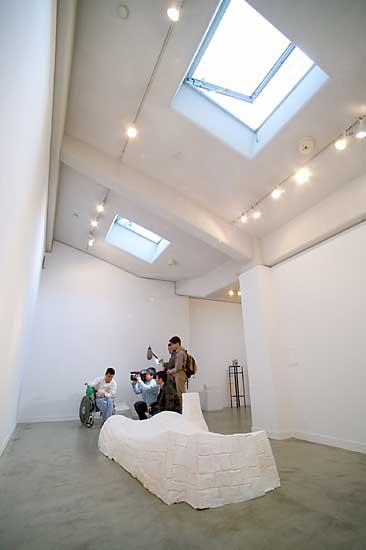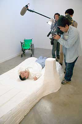 左の写真では一見怪しげな撮影に見えなくもありませんが、彼らはNHKの福祉番組『きらっといきる』の撮影チームです。このところずっとボクに張り付いて取材していて、この日も朝から撮影でした。「あたし達はいないと思って普段通りにやってください」なんて言われてもねぇ。でも、NHKさんのおかげで今回のギャラリー拝見が久々に出来たといっても過言ではありません。感謝感謝です。