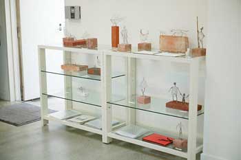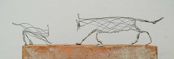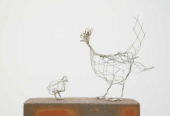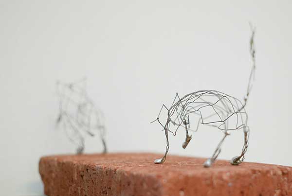 これらは、大作の合間に気分転換に作ってみることが多いそうです。制作時間は30分から1時間程度。針金をいじっていると、たまたま面白い形になったりするので楽しいと言ってました。作品作りは時間をかければいいものが出来るというわけではありません。偶然出来た奇妙さ面白さには、どんなに時間をかけて頑張ったところでかなわない。ボクも絵を描いていてつくづく思います。ただ、その偶然の面白さを見つけられるか、そこに少し手を加えて作品として完成させられるかがアーティストとしての腕の見せ所ではないでしょうか。大作とは違った緊張感のある空気をお楽しみ下さい。