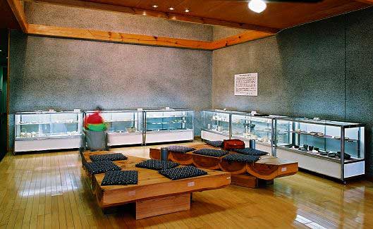神山温泉「四季の里」に入ると、右側にフロント、正面にギャラリーがありました。ギャラリー自体はそんなに広くないのですが、ロビーから続く空間に丸太を並べた腰掛けを配置し、くつろげる雰囲気が演出されていました。