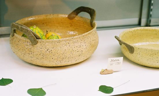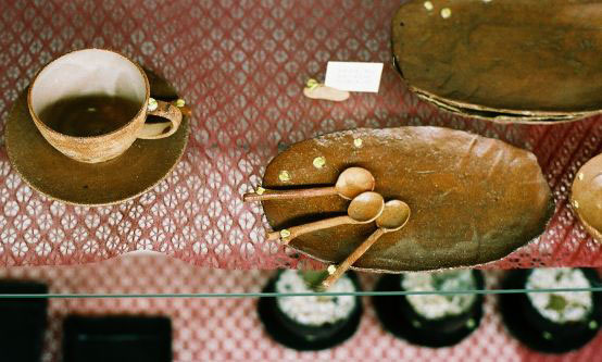 作品は左から、春・夏・秋・冬の順に並べられていました。でもディスプレイケースは全部で六つ。春と夏の間には初夏の器が、秋と冬の間には晩秋の器がディスプレイされていたような気がします。作品数は40点〜50点というところでしょうか。1つ500円〜30,000円程度で販売もされていました。