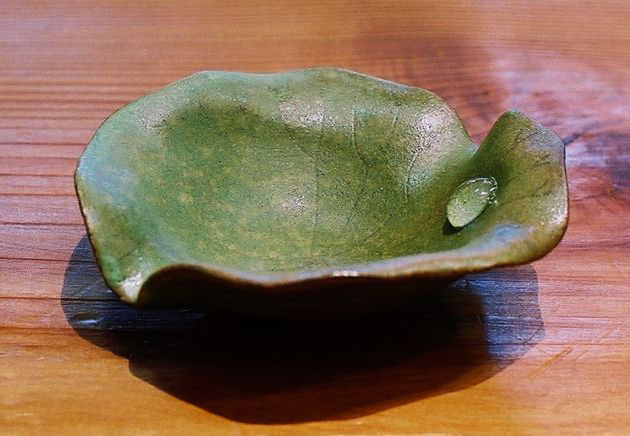 「雨上がりの宝石」 これは蓮の葉でしょうか。そして自分の顔が映り込みそうな不純物のない透明の雫。上の作品は10cm程の小鉢ですが、30cmを越える大きなお皿もありました。正直言って、これらの作品群を見るまでは「普通の作品だな」と思っていました。確かに春夏秋冬それぞれの味わいはありましたが、何をどうコメントしようかと困っていました。そんな中で蓮の葉の大皿を見つけ、そのリアルさに釘付けになりました。まず驚いたのが、蓮の葉の質感までを表現したグリーン。織部のようで織部でない。一応おかしな壺を焼いているけれど、本格的な釉薬の勉強をしていないボクには、どんな釉薬を使ってどんな焼き方をしているのか分かりませんでした。また、歪めるのを得意とするボクとしては、小鉢の歪み具合もたまりません。小鉢が小鉢でなく葉っぱそのものに見えていました。それに朝露のようなガラス玉。これをどのようにくっつけたのか、どんなタイミングでガラスを垂らしたのか、興味は尽きません。取材のことは忘れ、しばらく見入ってしまっていました。西さんが作り出した夏の朝のすがすがしい風景の中に迷い込んでいくようでした。