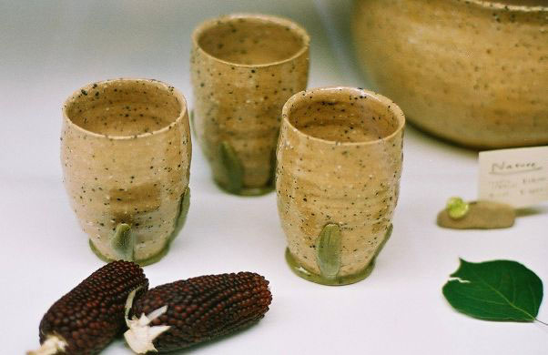 湯飲みにくっついているのは虫でしょうか、樹の新芽でしょうか。それとも全く違うものでしょうか。何にしても面白いと思います。作り方は、はじめに湯飲みを形成しておいて、種類が違う別の粘土で虫のようなモノを作りくっつける。ここまではそんなに大変な作業ではないと思いますが、イメージ通りの色を出すのが難しい。そして何より、こういう湯飲みを作ろうと思ったことに拍手を送ります。