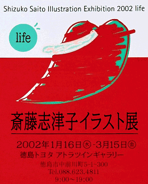 斎藤さんは、板野郡藍住町在住。徳島県美術展のデザイン部門にはここ20年ほど毎年出品しているそうで、入選はもとより特選・準特選を多数獲得しています。また96年から4年間、イラストとエッセイで綴った「街角ウォッチング」などを徳島新聞に連載。夫であり、やはりイラストレーターの斎藤繁次さんとは毎年に何回か個展などを開いているようです。_ トヨタの受付のおねぇちゃんです。会場に行くとコーヒーを入れてくれたりします。ボクも一杯戴きました。