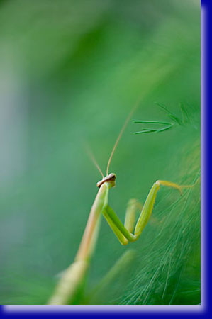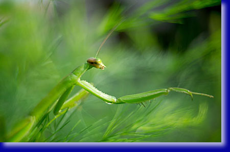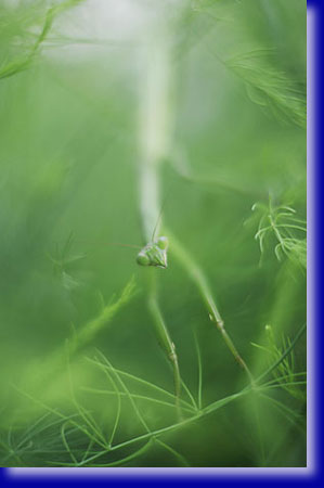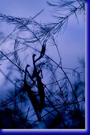 ある日やや小ぶり、背中の一部がオレンジ色のもう一匹のカマキリを発見いたしました。種類は同じ様です。元からいるカマキリと40cmの程距離を持って対峙しています。互いに動かず風になびいてふらふら揺れる枝にのっかって、、どうなるのだろう。朝の忙しい時間ですしそんなに観察している時間はありません。けんかしたらあかんよ、とその朝はそのまま仕事に出ました。夕刻に帰ってきたら同じポーズのまま2匹が対峙継続中にびっくりいたしました。すでに夕闇が迫ってもう撮影は無理だしその日はそれまでにいたしました。 翌朝、新聞と牛乳を取りに玄関先にゆくと2匹がせっせと繋がってフンフンXXXしていました。2匹は男と女だったわけですね。私も条件反射のようにソフトなアンジェニューレンズを装着しお二人の子孫繁栄共同作業の一部始終を撮影記録させて頂きました。まあそんなんでオスメスの区別もついたし上手くいけば産卵、増殖パターンが観察できそうとわくわく致しました。 |
