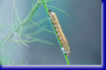 うちのアスパラにはもともとアブラ虫とか見かけなかったのですが現実に2匹のカマキリは何を食べているのかさっぱりわかりません。肉食の彼等が生きているのだから何かはいるのでしょうね。何を食べていたのか?それが明らかになったのは秋も深まってからの事です。彼等がいなくなった後イモムシさんが葉っぱを食べているのを見かけて日ごとに体が大きくなり数が増えて見えました。頭部は右下で尻が左上になります。ただ今排せつ中・・逆立ちしてウンチしたら己にかかるやろー??よけいな心配でした。何になるけむしさんか知りませんが、なかなかシックなボディーでした。暖冬でボデーカラーと背景の色が合わない・・これも異常事態なのでしょうかすぐに雀のえさになってしまう運命です。