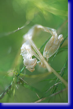 イモムシさんをどうしようと観察していたらミイラ化した遺骸を発見、最期は雀に食らわれたかと思っていましたがそうではありませんでした。そしてその上部位置に卵の固まりが2つ並んで産みつけられていました。アスパラには毎年肥料を与えているわけでなく枯れかけた枝葉を少し短く切り表面に敷き詰めているだけなのです。さてさて枝葉の上部に卵がのっかっています。回りの枝葉は毎年のように切り落として一部だけ残しました。後日卵の殻の一部が何かで突かれているのを発見、少し欠けていましたので、やっぱり刈り込んだのが原因か?と反省、対処しなくてはと回りを網で囲み鳥の侵入を断ちました。 |