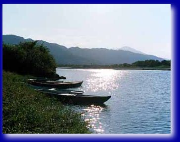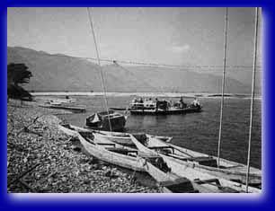 はい、これが岸から見た「岡田式渡し船」です。山の少し上のラインにワイヤーと滑車が見えるでしょうか、黒い点が滑車ですね、そこからまたワイヤーが船までのびています。「岡田式渡し船」は水の流れる力を推進力にしています。丁度ヨットが横風を帆に受けて斜に進む理屈で川の流れる力を利用してるんですね。自然とつき合う先人の知恵にホント感心させられます。撮影は「幸田美穂」コウダヨシホ、父の撮影です。あまり変わっていない?いやいや次ぎを御覧下さい。あ