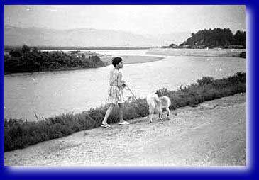 この写真は彼岸に「切幡寺」へ川島から「岡田式渡し船」に乗って善入寺島を通りお参りに行くところです。二人は兄弟でなぜか長靴をはいています。