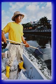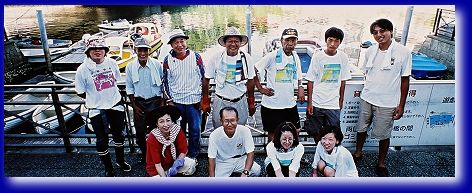 (25)川を掃除し続けているひと達がいます。最初は一人で始めてだんだん人が集まってきて、「新町川を守る会」が出発してもう何年になりますやら。阿波踊りの期間中は早朝清掃です。ふとどき者が川に投げ込んだ空き缶等を舟に乗ってすくいます。「何かむしゃくしゃしてポーンと放る気持もわかるけんどなぁ、そこで止めてほしいんよ。」と笑う人がいます。Nさんと今年も集まった多くの方々。