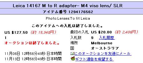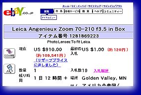 ■何を血迷ったのか入札競争をしてる様子。端で観戦していると、えらいつりあがってるのがわかります。私がウェブショップで購入した価格をオークション終了1日半前にすでに$115.00オーバーしていますね。クールに観察しているのも一興でオマス。$1.000まではいかんだろうと踏んでいますが、近くまでいっちゃうカモ。プププのプです。10/13(Sun)REを発送したとのメールを受け、同時にオリンパス180/f2に買い手がついて万々歳です。予定のR6.2の新品(黒)を電話予約して完璧でしょうか。