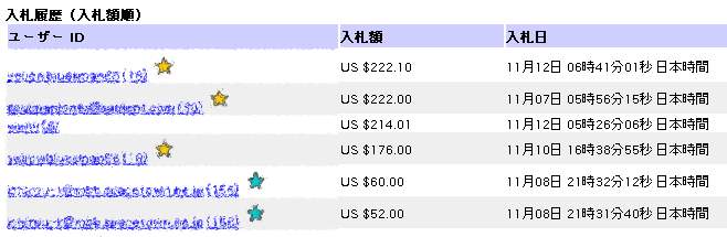 2番手の方2並びでした。(涙)1番手と4番手が私でございます。12日月曜日午前11時前に閉るオークションでしたので、12日の朝は最後の入札チャンスだったんです。御覧頂けています下の入札額は終了時まで伏せられています。私が入札する直前の提示額は$219.01でした。これはコンピューターがその時点での2番手さんとの開きぐあいを塩梅して$219.01となっていたわけです。んで私は219→220+→222→222+→222.10の順に考えが進みエイヤっと入札し、お昼過ぎ恐る恐る開けたら僅差の10セントで勝てたラッキービッダーになってたわけです。2番手の方さぞさぞお腹立ちの事と存じますが、私目も何度か最後の30秒でひっくり返された経験がございまして、お察し致します。終了5時間前での入札なのでハンター行為でもないし、アンフェアな事はしていませんからただのゴメンナシテです。