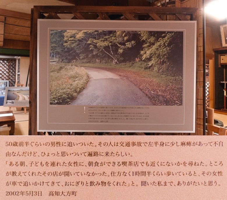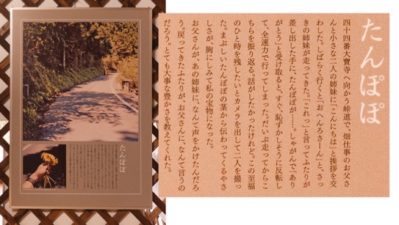 遍路歩記 写真日記展は、途切れ途切れの休日遍路(区切り打ち)の道中で出会った人・動物・風景など感じた事をありのまま撮影し、その時の気持ちを言葉にし、パネルにデザインレイアウトした作品展です。
