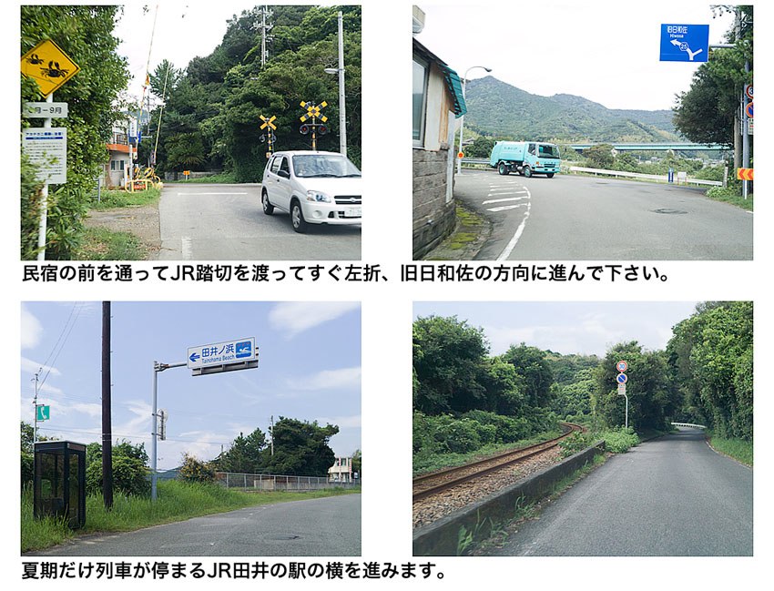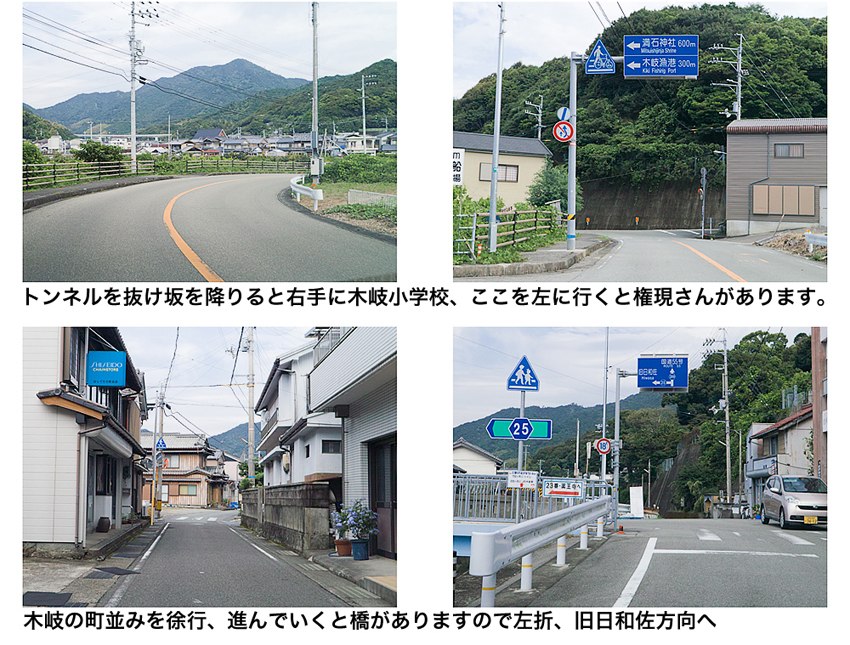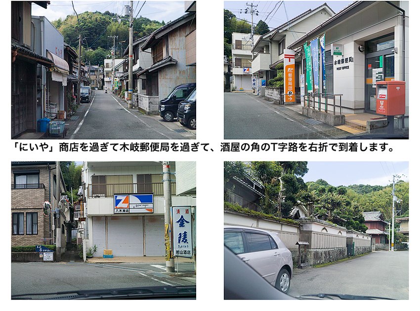 実は日和佐の北に位置します。木岐のメインストリートは日和佐薬王寺への歩き遍路道です。 インターネット上の地図ではまだ日和佐道路は未開通の状態ですが、阿南市福井のトンネルを2つ抜けると日和佐道路が完成していますので左折して下さい。自動車専用道路なので信号が無い高速道路のような立派な道です。ほんの少し走ってトンネルを抜けてすぐの由岐出口を降りて下さい。由岐坂トンネルを抜けたら由岐町-田井ノ浜を経て木岐トンネルを抜けたら木岐の街です。くねくねと木岐の町並みを道なりに進むと左にコンクリート橋がありますので旧日和佐方面へ左折、木岐橋を渡って直進、木岐郵便局があって突き当たりに酒屋とギャラリーの看板があります。