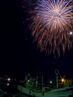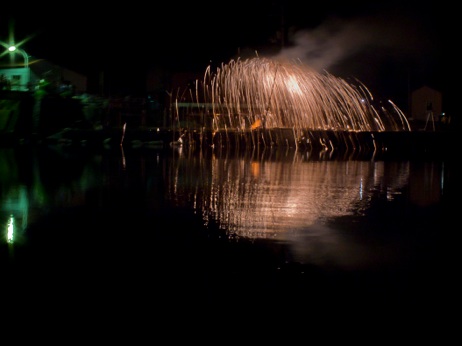 昼間は御神輿、夜は花火、子供御輿・獅子舞もあって、賑やかです。今年は相生の方からの仕掛け花火が彩りを添え、港に轟音がこだまする地域の勢いを感じました。
