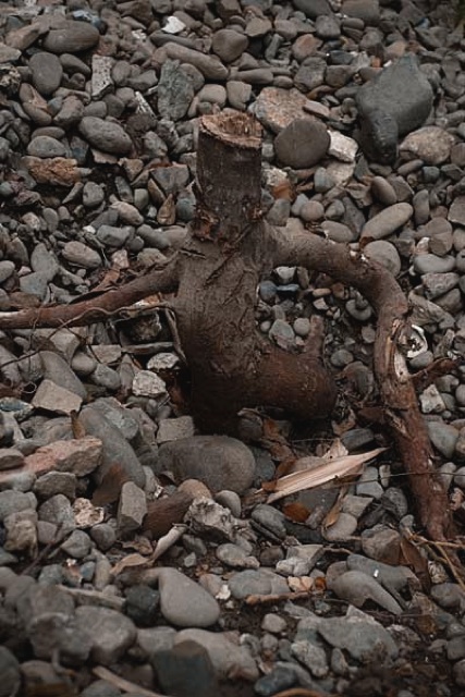 右はお庭の端っこで見つけました何かの根っこ部分と思います。那賀川河口付近の土地柄らしく石ころの角がとれてて丸い。そこの土中から傷つきつつ出てくる様に見えたので写しました。