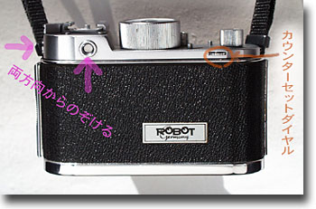 裏蓋を閉め青矢印を押しながら赤い矢印方向に歯車を回せばゼロカウンターがセット出来ます。36枚撮りで53,4枚撮影出来ます。24枚撮りで36枚だったと思います。
