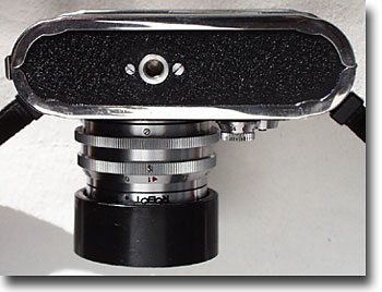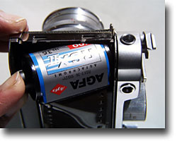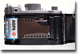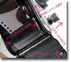 いよいよカメラへの装填です。まきもどしレバーを定位置に戻します。巻き上げ軸受けノブを持ち上げマガジンを入れます。ボディーにスリットがあってマガジンのボッチと凸凹状態が確認出来ます。裏蓋を閉める→裏蓋に付いている凸がマガジンを押す→マガジンの口が開く、、一連の動作を可能にしています。ライカやキャノン、ニコンもマガジン使用時は裏蓋のロック解除でマガジンが開く動作になる仕掛けですが、使う側にとってはロボット式の方が優れていると思います。