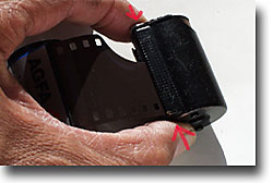 巻き取り軸のノブを矢印の方向に回したるみを取りスプロケットギヤとパーフォレーションを噛み合わせます。