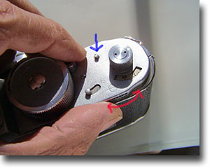 巻き上げ側は左の画像、軸の部分と2つに分かれるフィルムマガジン=反復使用可のパトローネ形状の合計3つで構成されます。 左図の赤い矢印の動きで軸に先端を差し込み降ろし引っ掛けます。実に味わい深く確実に絡みます。 外す時は逆の動作を、いったん押してから穴をずらして引き抜く、、厳かです。 左図:内側になるフィルムマガジンのひとつに装填します。右図:次に右の画像の様に2つのマガジンを合体させます。 内側に向かって2つのマガジンを合わせると軽い手ごたえがあります。ね、簡単でしかも正確な動きや働きを楽しめます。 いよいよカメラへの装填です。まきもどしレバーを定位置に戻します。巻き上げ軸受けノブを持ち上げマガジンを入れます。ボディーにスリットがあってマガジンのボッチと凸凹状態が確認出来ます。裏蓋を閉める→裏蓋に付いている凸がマガジンを押す→マガジンの口が開く、、一連の動作を可能にしています。ライカやキャノン、ニコンもマガジン使用時は裏蓋のロック解除でマガジンが開く動作になる仕掛けですが、使う側にとってはロボット式の方が優れていると思います。 巻き取り側を装填したらこんどはパトローネを定位置に滑り込ませてほぼ完了、ここまで出来たら後はどんなカメラでもほとんど同じでフィルムが確実に送られている事を確認するだけですね。 巻き取り軸のノブを矢印の方向に回したるみを取りスプロケットギヤとパーフォレーションを噛み合わせます。 空写しすると巻き戻しレバー中心のマイナスネジがくるくる回ってフィルム送りが確認出来ます。巻き上げノブはフィルムが入って無くても回りますがシャッターボタンから指を離したら回りますので不思議と指先と接触は致しません。 裏蓋を閉め青矢印を押しながら赤い矢印方向に歯車を回せばゼロカウンターがセット出来ます。36枚撮りで53,4枚撮影出来ます。24枚撮りで36枚だったと思います。