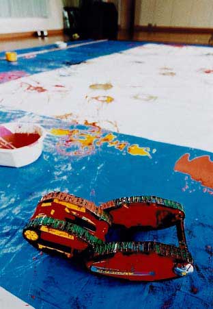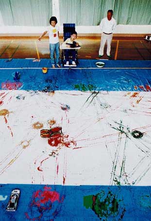 場所は体育館で、ブルーシートを張って養生しました。画面左は指導する美鳥悦子さん、中央は制作者の生徒さん、その右は「じいちゃん」です。技法もなんも見たら解りますね。指先だけで絵が描けるのです。